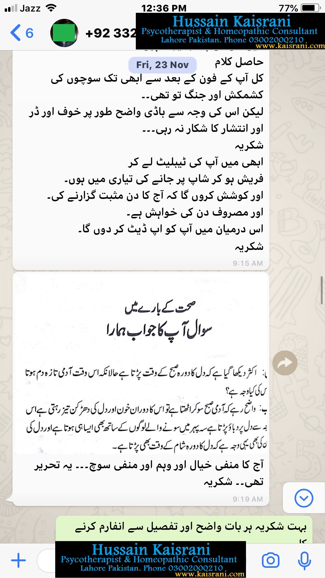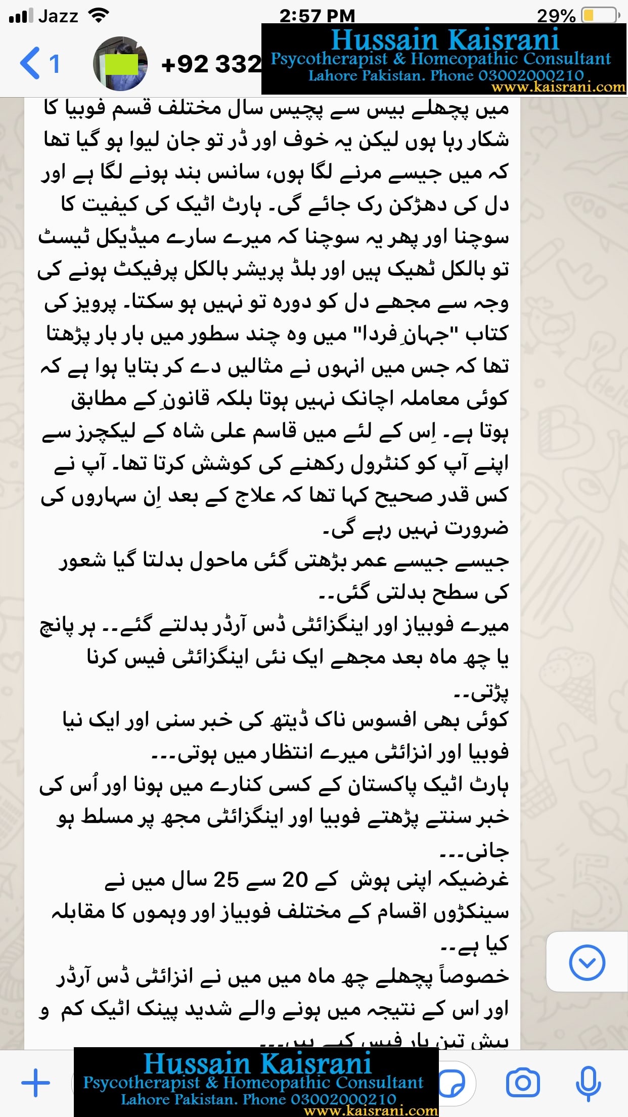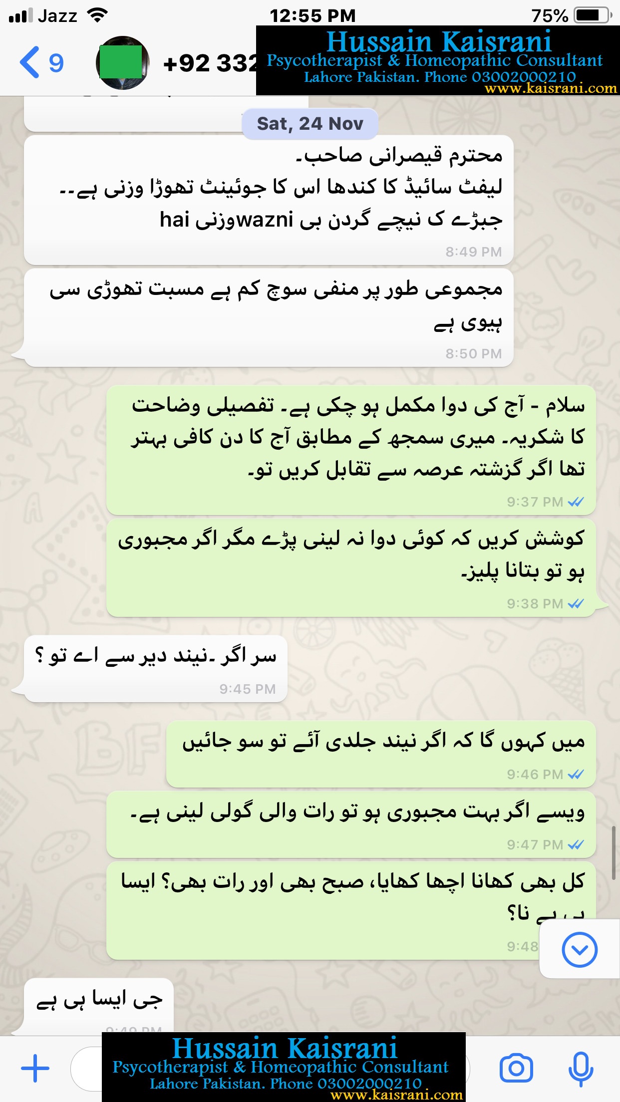 حسین قیصرانی ۔ سائیکوتھراپسٹ & ہومیوپیتھک کنسلٹنٹ ۔ لاہور پاکستان فون نمبر 03002000210۔