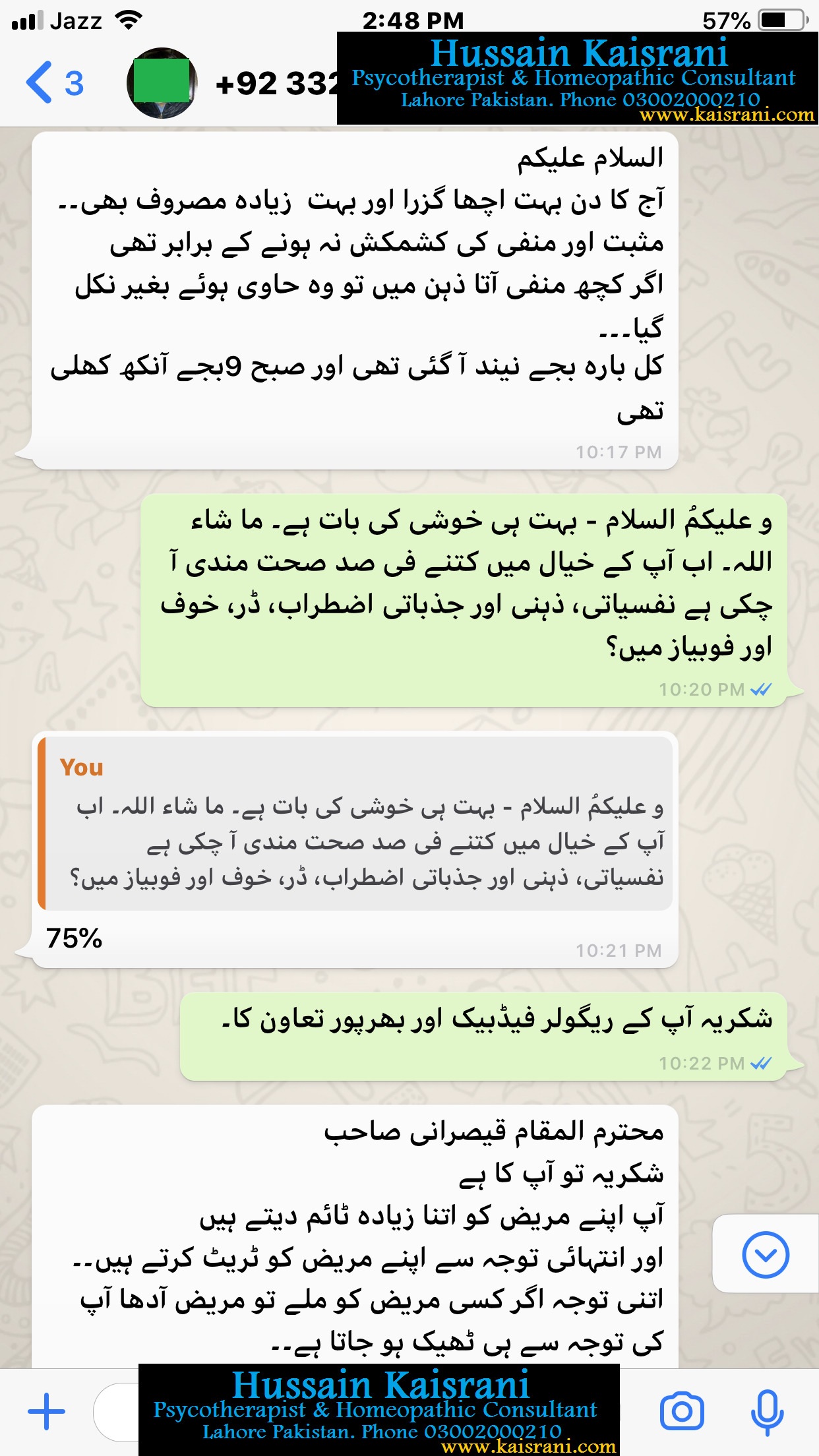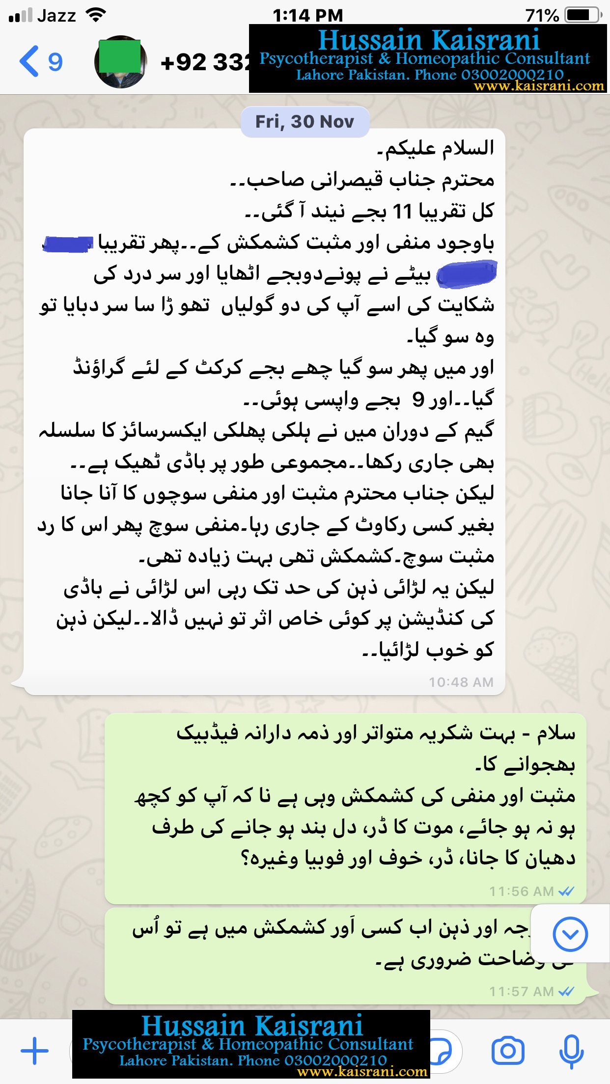 اللہ تعالی کا لاکھ لاکھ شکر گزار ہوں اور اپنے معالج کا شکریہ ادا کرتا ہوں جن کی بہت توجہ اور مسلسل آن لائن ٹریٹمنٹ اور گائیڈنس کی وجہ سے میں واپس اپنی اصل زندگی کی طرف آنے میں کامیاب ہو چکا ہوں۔۔ اپنے کاروبار کو مکمل اور بہتر انداز سے چلانا شروع کر دیا ہے۔ گھریلو معاملات بھی بہتر انداز سے ڈیل کرنے لگ گیا ہوں۔ اور حالات بہتر سے بہترین کی طرف جا رہے ہیں۔۔۔