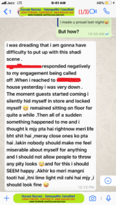 جواب تھا: مجھے خدشہ تھا کہ شادی کے پروگرام میں، مَیں کیسے سب کا سامنا کروں گی۔ میرے رشتہ داروں میں میری منگنی ٹوٹنے کو بہت منفی انداز میں لیا گیا تھا۔ اِس پس منظر میں، مَیں جب شادی والے گھر پہنچی تو بہت مایوس اور پریشان تھی۔ جونہی مہمانوں کی آمد شروع ہوئی؛ میں نے اپنے آپ کو چُھپانے کے لئے سٹور کا رُخ کیا، کنڈی لگائی اور فرش پر ہی بیٹھ گئی۔ پھر نجانے یکدم کیا ہوا کہ میں نے سوچا کہ مجھے پتہ ہے کہ اِن دنوں میری زندگی تباہ ہو چکی ہے۔ میرے قریبی لوگوں کو سب معلوم ہے۔ لیکن مَیں اِن کو اِس بات کا موقع کیوں دوں کہ وہ مجھے لاچارگی اور رحم کی نظر سے دیکھیں۔
