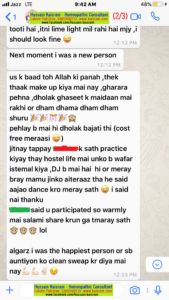 اُس کے بعد تو پھر خدا کی پناہ ہی بھلی۔ میں نے ٹھیک ٹھاک میک اَپ کیا؛ غرارہ پہنا، ڈھولک گھسیٹ کر میدان میں رکھی اور دھم دھما دھم دھم دھما دھم شروع۔ ویسے بھی پہلے مَیں ہی ڈھولک بجاتی تھی (مفت کی میراثن جو ٹھہری)۔ جتنے ٹپے ۔۔۔۔ ۔۔۔۔ کے ساتھ ہوسٹل لائف میں پریکٹس کئے تھے اُن سب کا وافر استعمال کیا۔ ڈی جے بھی میں ہی بن گئی۔ جن کو میرے بارے میں اعتراض تھا وہ اب اپنے ساتھ ڈانس کرنے کی دعوت دینے لگے جسے میں نے شکریہ کے ساتھ رَد کر دیا۔
