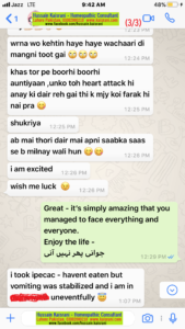 ہاں! میں نے ایپیکاک (ہومیوپیتھک دوا) لی ہے۔ میں نے اگرچہ کچھ نہیں کھایا لیکن میری قے اور اُلٹی کا مسئلہ ٹھیک ہو گیا۔ اب میں اپنے گھر واپس آ گئی ہوں اور بالکل ٹھیک ہوں۔