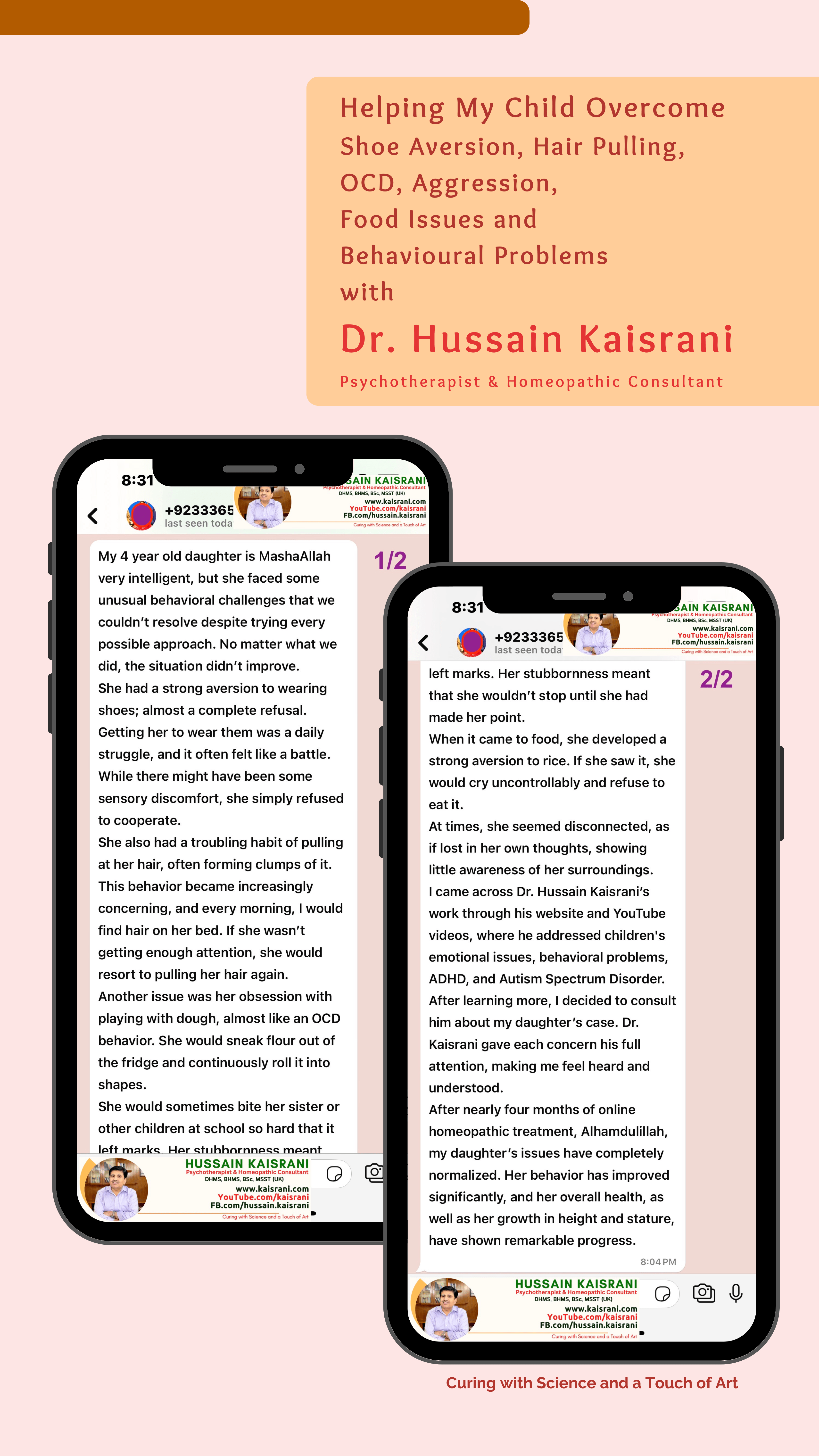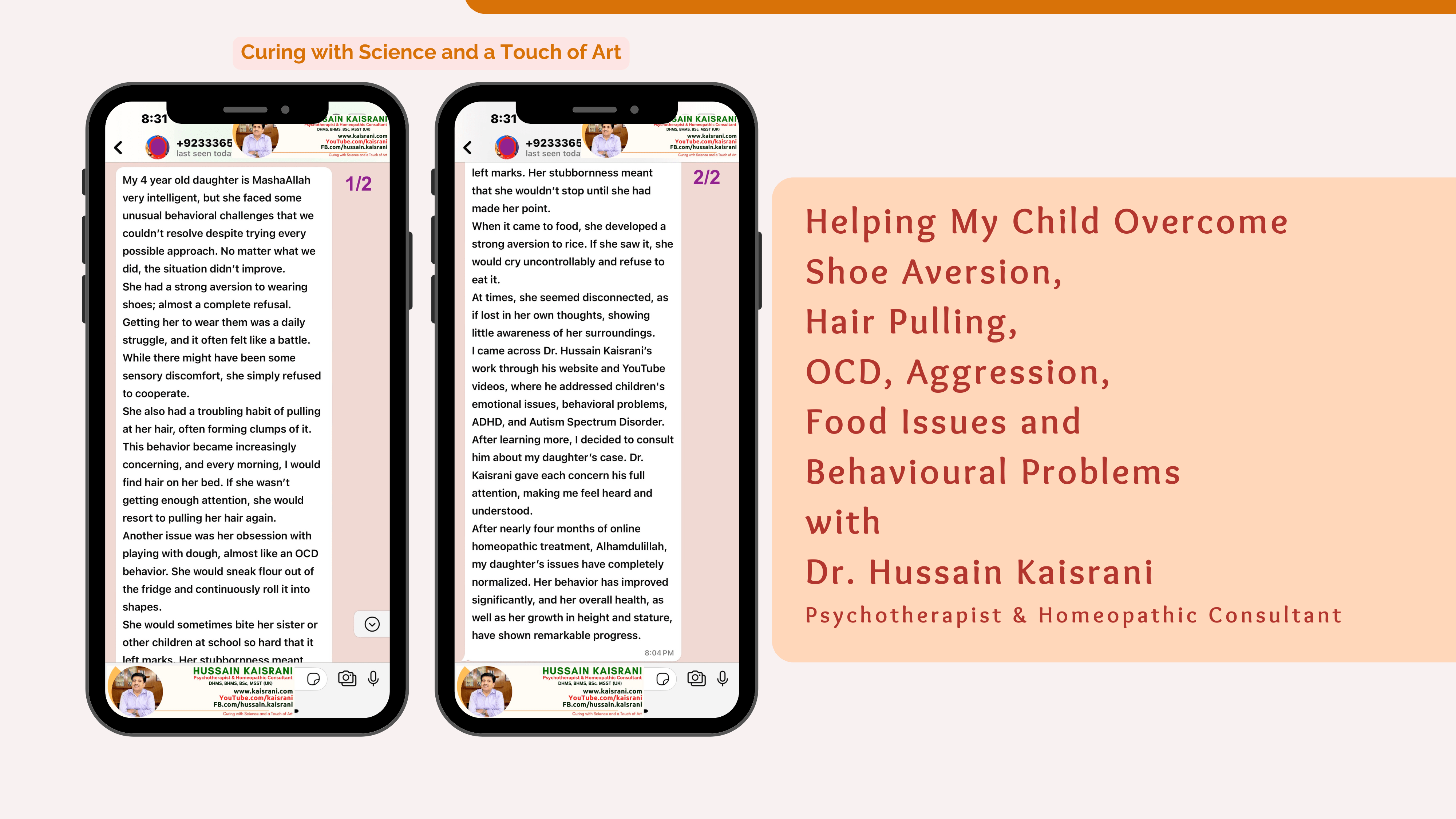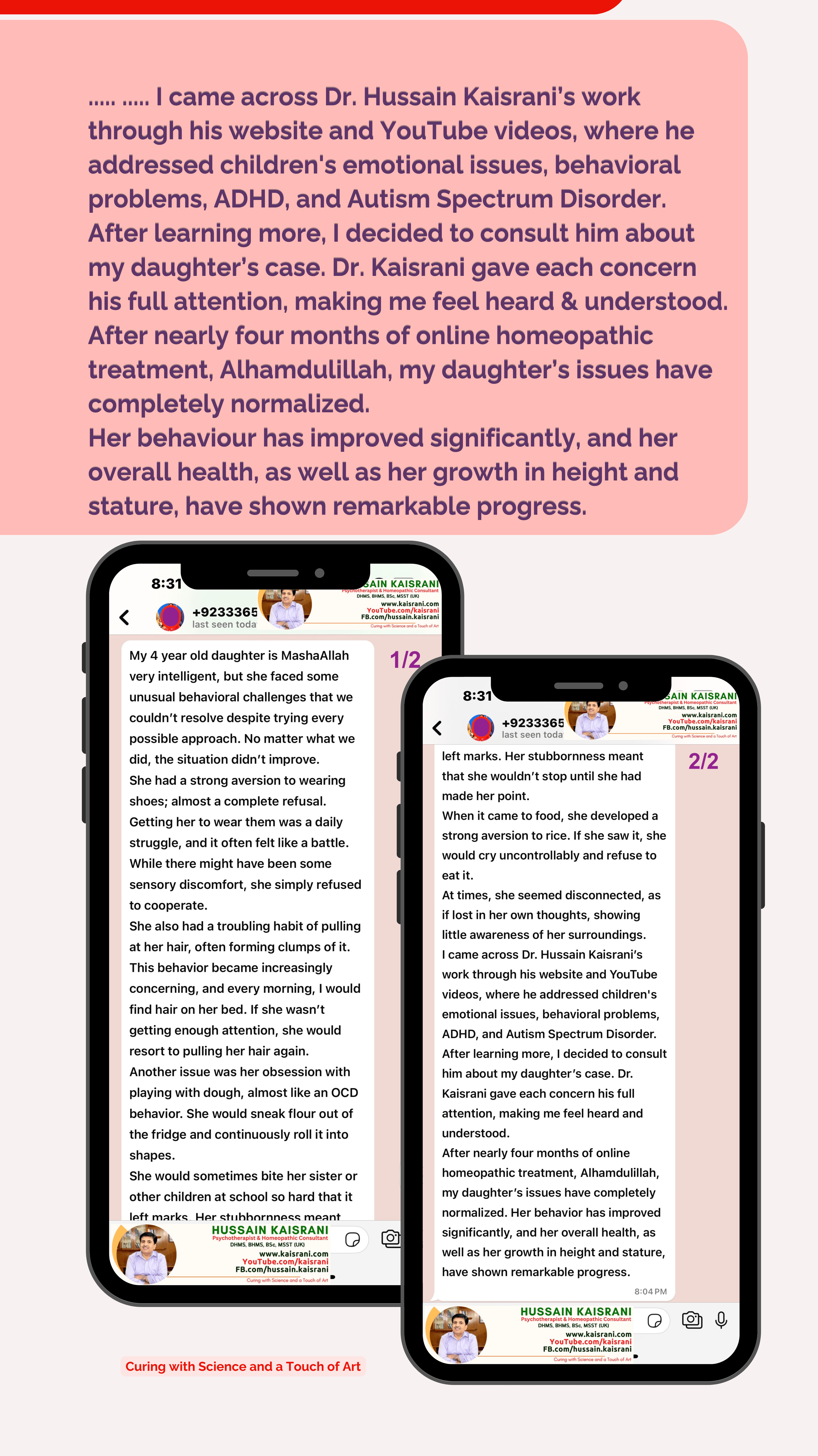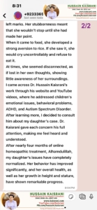 After searching for solutions online, I came across Dr. Hussain Kaisrani’s work through his website and YouTube videos. He addressed children’s emotional and behavioural issues, including ADHD and Autism Spectrum Disorder. After learning more, I decided to consult him about my daughter’s case. Dr. Kaisrani took the time to listen to every concern and provided the attention my daughter needed.