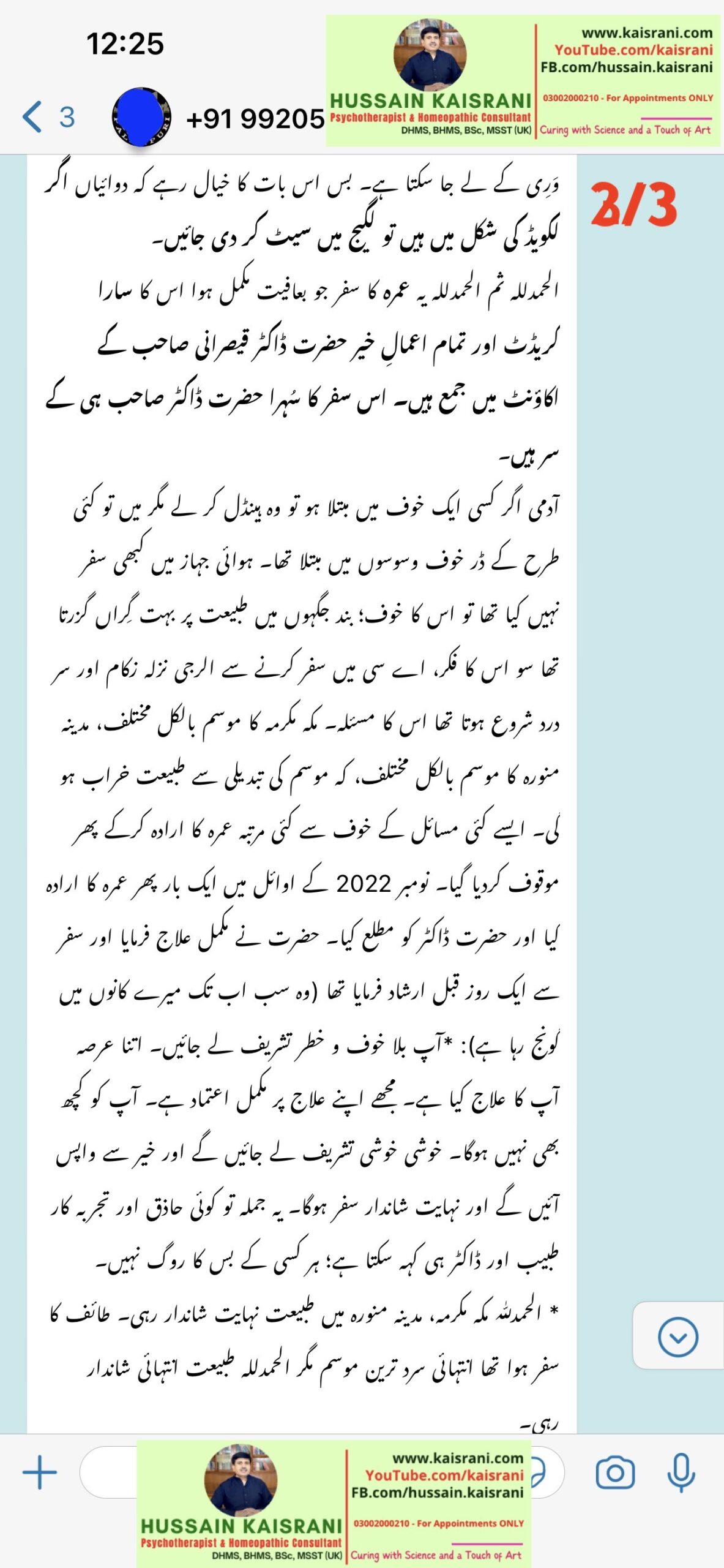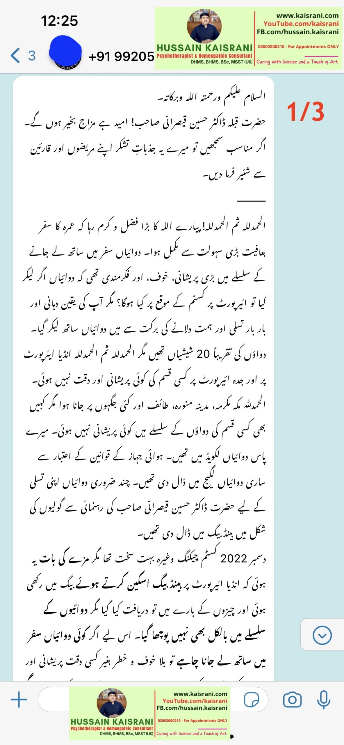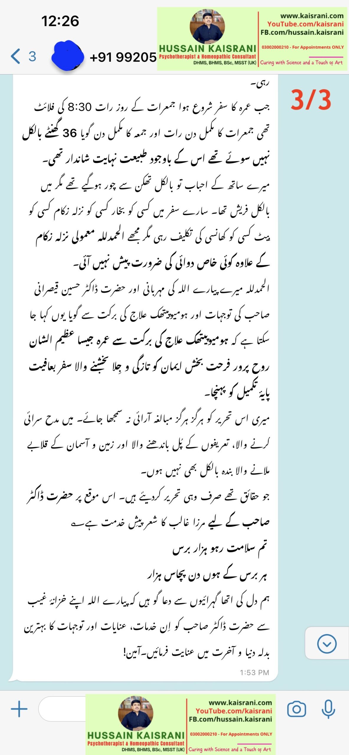 الحمدللہ میرے پیارے اللہ کی مہربانی اور حضرت ڈاکٹر حسین قیصرانی صاحب کی توجہات اور ہومیوپیتھک علاج کی برکت سے گویا یوں کہا جا سکتا ہے کہ ہومیوپیتھک علاج کی برکت سے عمرہ جیسا عظیم الشان روح پرور فرحت بخش ایمان کو تازگی و جِلا بخشنے والا سفر بعافیت پایۂ تکمیل کو پہنچا۔
