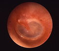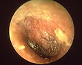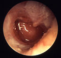 Treatment of acute otitis media is controversial. Much of the controversy centers around the difficulty of distinguishing viral infection from bacterial infection and the fact that viral infection can progress to bacterial infection at any time. Primary care providers, such as general practitioners and pediatricians, often have a monocular otoscope and perhaps a tympanometer as their only diagnostic tools, which makes this distinction difficult, especially if the canal is small and there is wax in the ear that obscures a clear view of the eardrum. Also, an upset child’s crying can cause the eardrum to look inflamed due to causing distention of the small blood vessels on it, mimicking the redness associated with otitis media. Because of a tradition of inappropriate prescribing of antibiotics for viral acute otitis media, their use has recently been condemned by many primary care practitioners for most cases of acute otitis media. Ear specialists tend to disagree with this philosophy and promote efforts to distinguish between viral and bacterial infection, so as to optimize treatment results by giving antibiotics only for bacterial infection. Acute bacterial otitis media can cause pain that leads to sleepless nights for both children and parents, can cause eardrum perforations, not all of which heal, and can spread to cause mastoiditis and/or meningitis, brain abscess, and even death if a severe infection goes untreated long enough. High fever can occur and can cause febrile seizures. Appropriate antibiotic administration prevents most such complications. On the other hand, it is generally agreed that acute otitis media that is purely viral will usually resolve without antibiotic treatment, although associated persistent middle ear effusions may require medical intervention.[3][4][5]