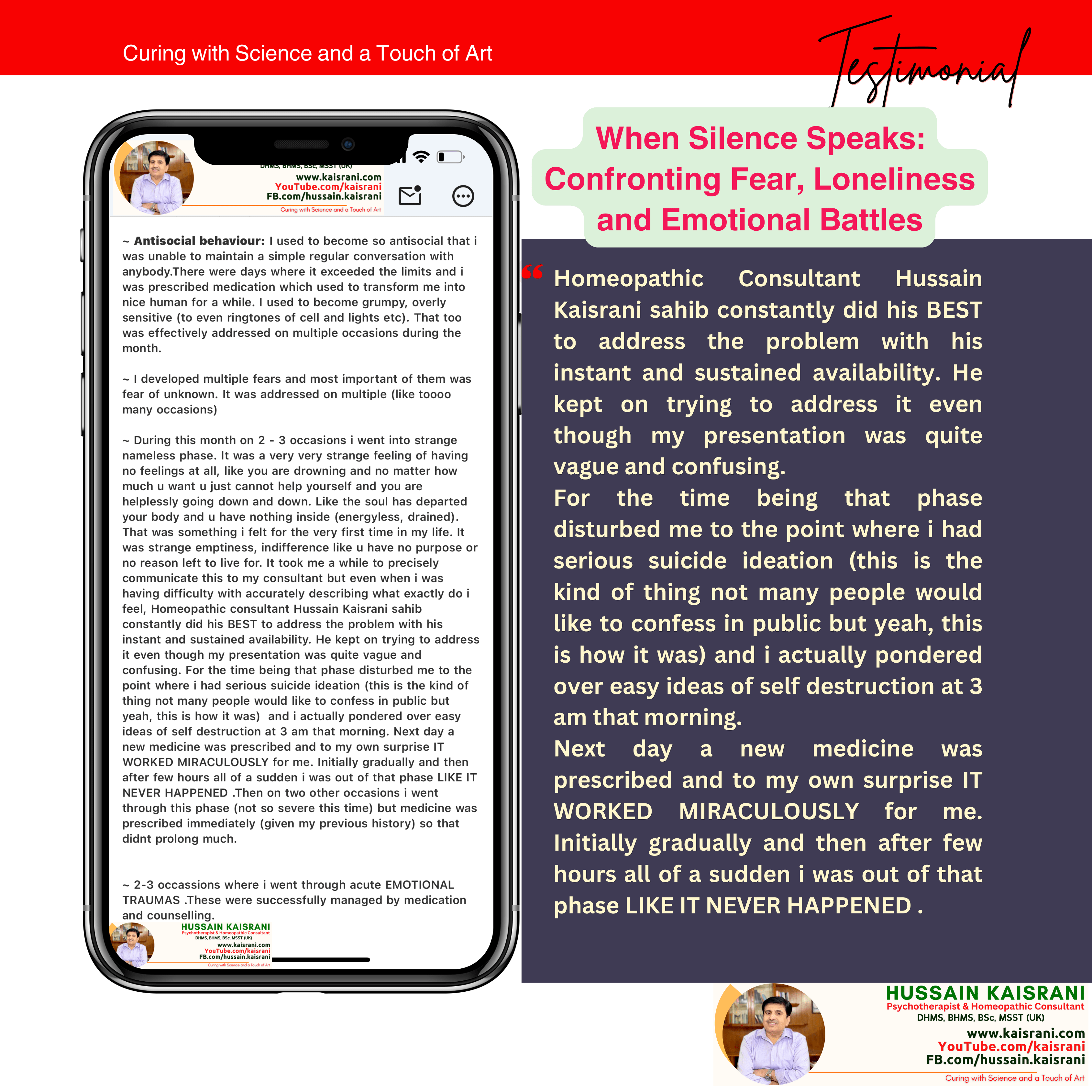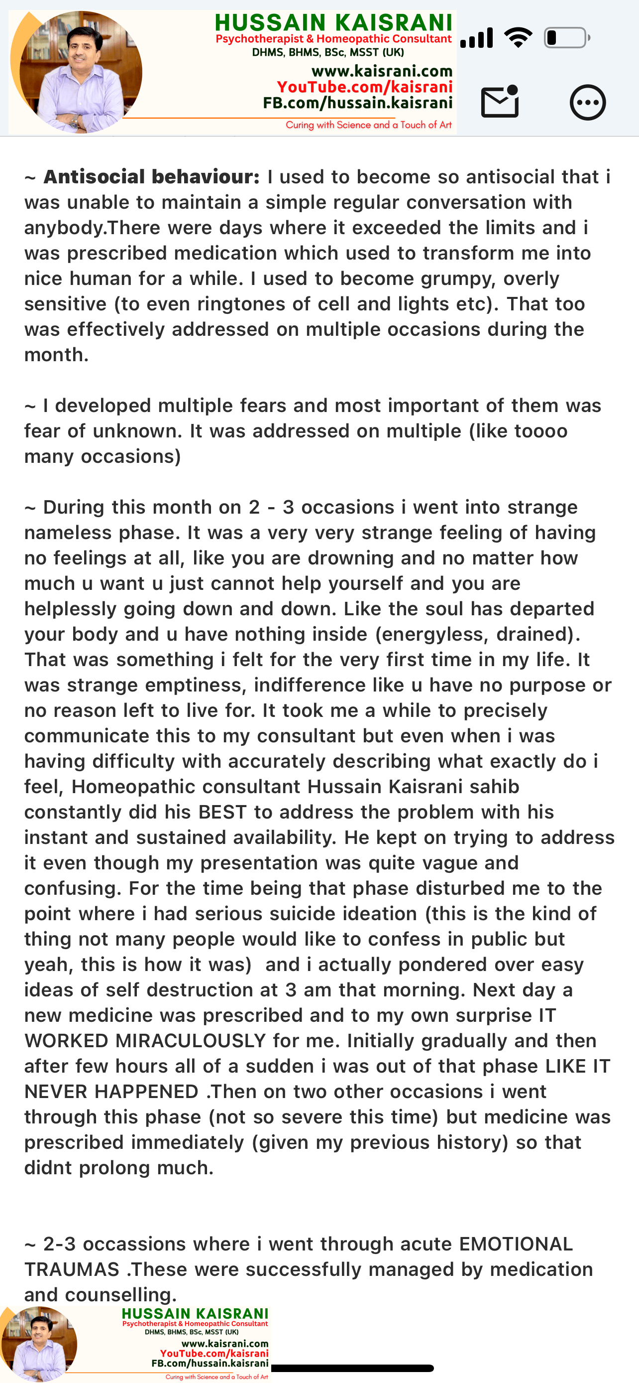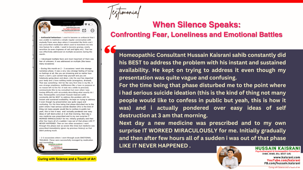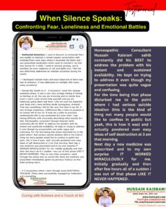 I struggled to communicate these feelings to my consultant, but Homeopathic Dr. Hussain Kaisrani remained available and dedicated. Even though I couldn’t fully explain what I was experiencing, he kept working to address my issue. During these dark moments, I faced serious suicidal thoughts; something many would hesitate to admit. I found myself contemplating self-destruction at 3 a.m. That following day, a new medicine was prescribed, and to my surprise, it worked MIRACULOUSLY. Relief was gradual at first, but within a few hours, it was as if the phase never happened.