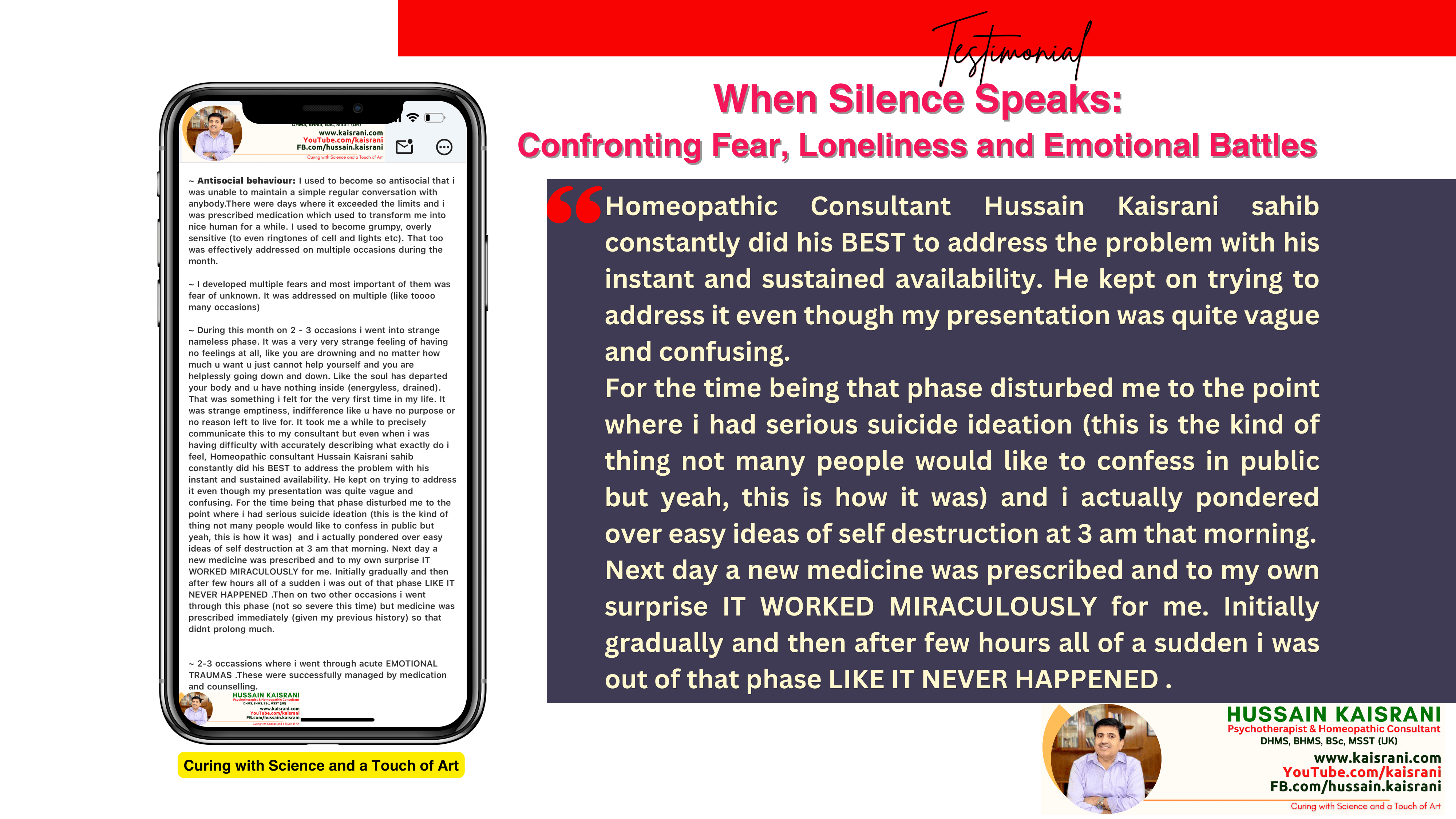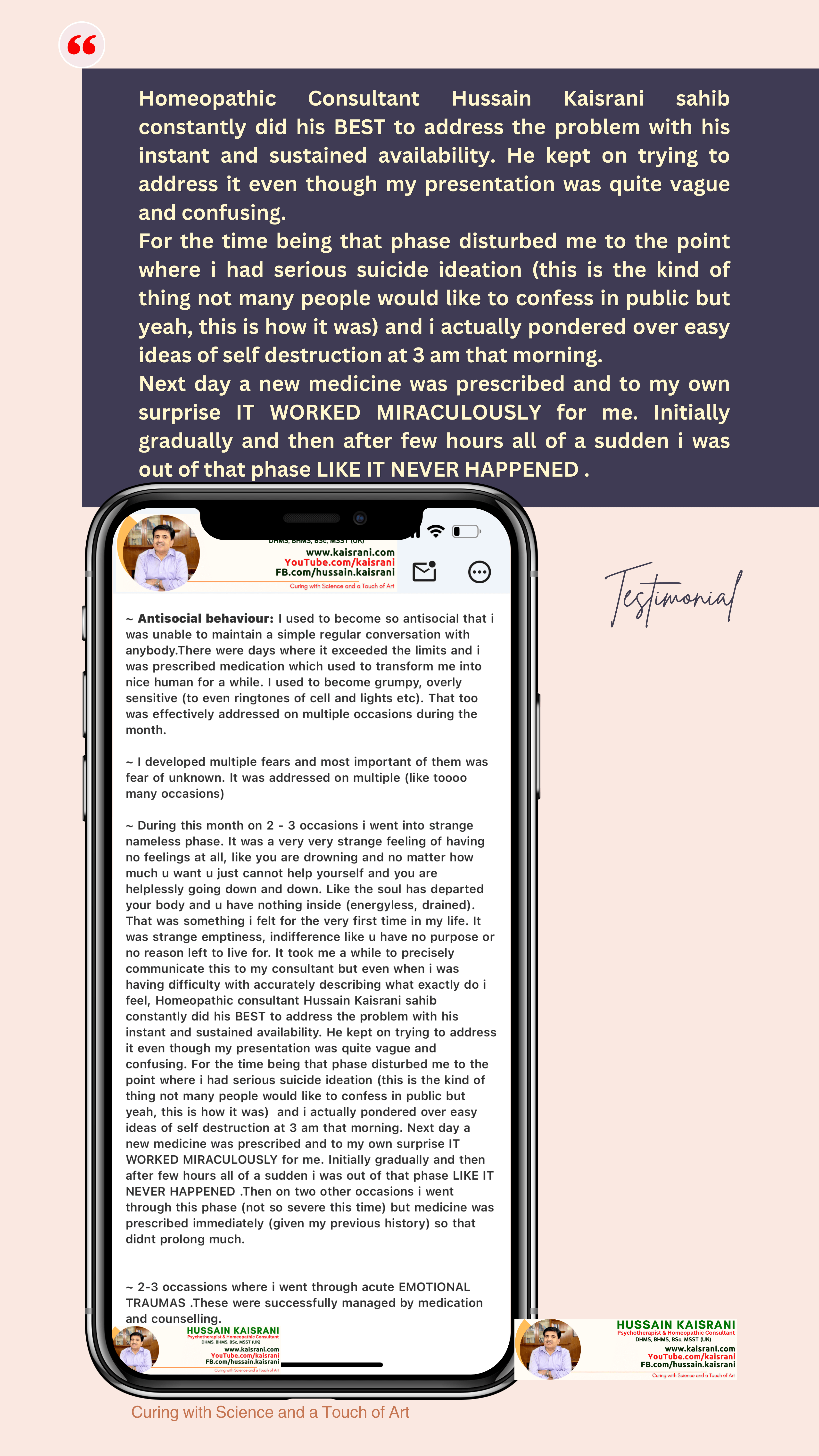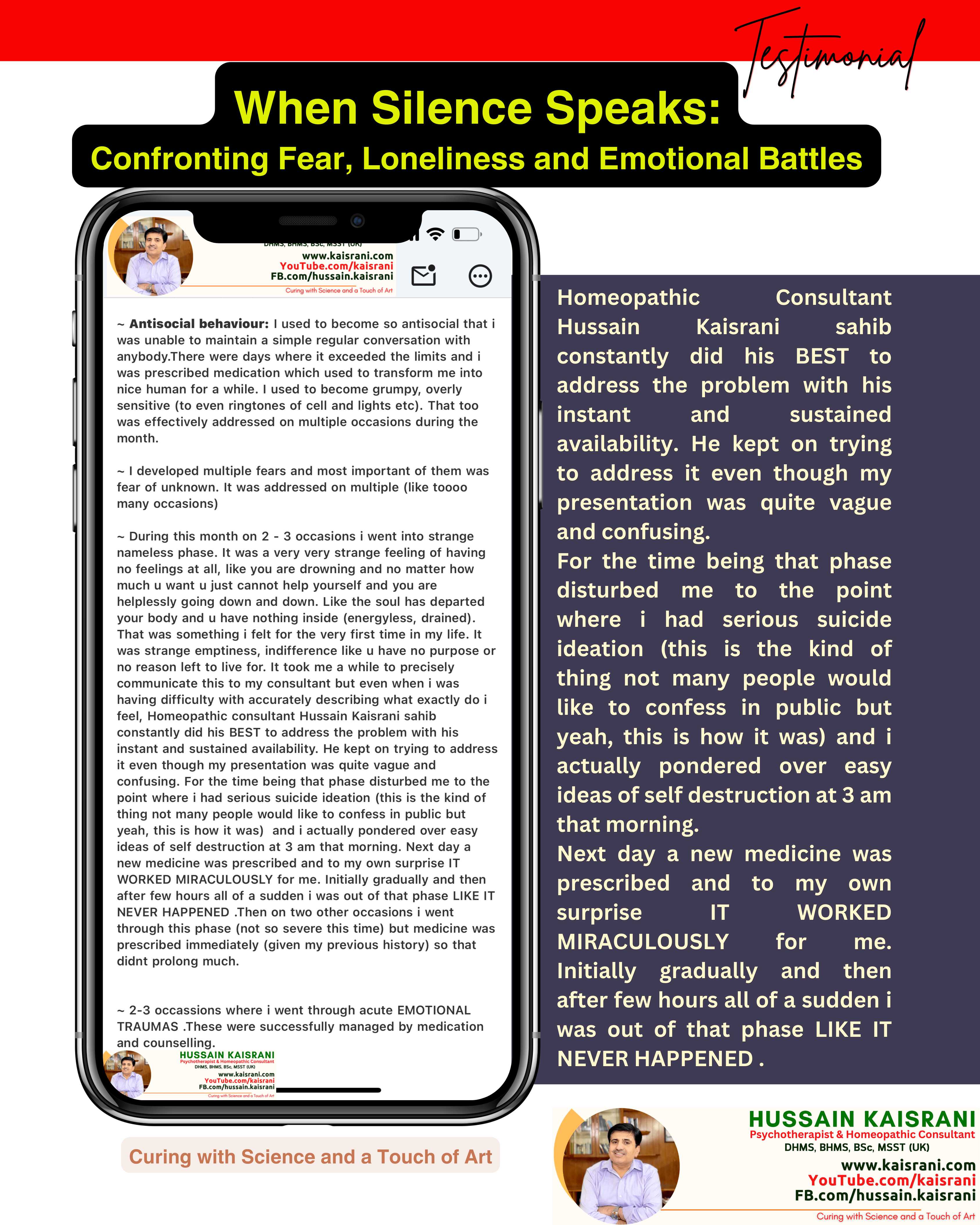 I struggled to communicate these feelings to my consultant, but Homeopathic Dr. Hussain Kaisrani remained available and dedicated. Even though I couldn’t fully explain what I was experiencing, he kept working to address my issue. During these dark moments, I faced serious suicidal thoughts; something many would hesitate to admit. I found myself contemplating self-destruction at 3 a.m. That following day, a new medicine was prescribed, and to my surprise, it worked MIRACULOUSLY. Relief was gradual at first, but within a few hours, it was as if the phase never happened.